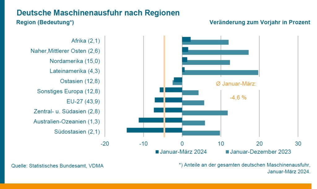 Die Exporte in die Partnerländer der Europäischen Union gingen im ersten Quartal nominal um 7,1 Prozent und damit stärker als in die übrige Welt zurück. Eine einsetzende Erholung in der EU ist umso bedeutender, als die EU-Partnerländer mit einem Anteil von 44 Prozent an den gesamten deutschen Maschinenexporten der mit Abstand wichtigste Absatzmarkt sind. Benedict Jeske vom VDMA kommentiert eine mögliche Erholung in der Europäischen Union: „Nach einer Phase der Stagnation im zweiten Halbjahr 2023 befindet sich die EU-Wirtschaft nun auf einem moderaten Erholungskurs. Der private Konsum dürfte die Triebfeder dieser Erholung sein. Die Investitionsgüterindustrie im Allgemeinen und der Maschinen- und Anlagenbau im Besonderen werden als Spätzykliker allerdings üblicherweise erst mit einer mehrmonatigen Verzögerung von der verbesserten Stimmung und Auslastung ihrer Kunden in der EU profitieren.“