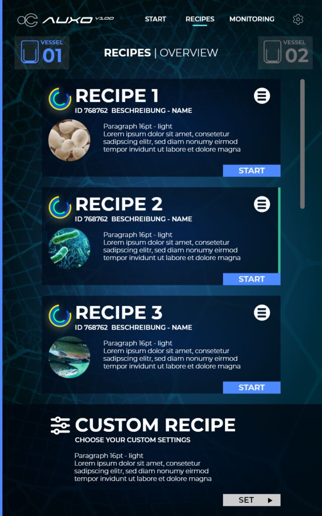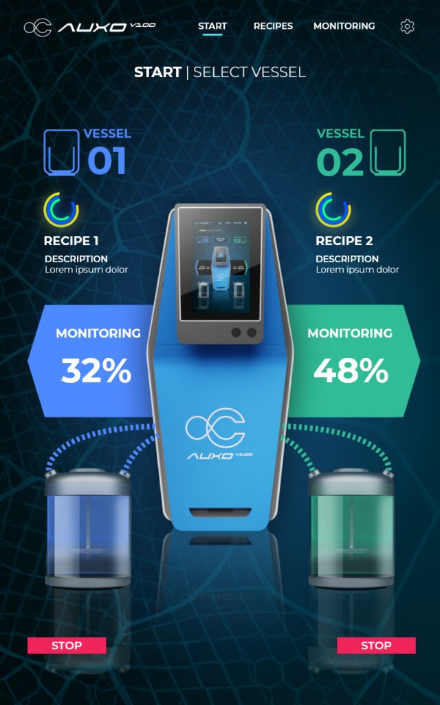 Durch das modellbasierte Design der Systemtechnik im neuen Auxo V und seine vielseitige Sensorik können Anwender die Anlage mit wenigen Einstellungen anpassen, um diverse Zellproduktionen im gleichen Reaktor auszuführen. Die Ansicht in Hexagon-Form auf dem Screen (siehe Bild rechts) visualisiert die Einteilung in die zwei Reaktorgefäße (Vessel) und deren Prozessstatus. Aus dieser Variabilität ergeben sich erhebliche Kosten- und Zeiteinsparungen. Durch die ansprechende Mensch-Maschine-Schnittstelle und die integrierte SPS ist der Automatisierungsgrad hoch und der Bioreaktor ohne Expertenwissen nutzbar.