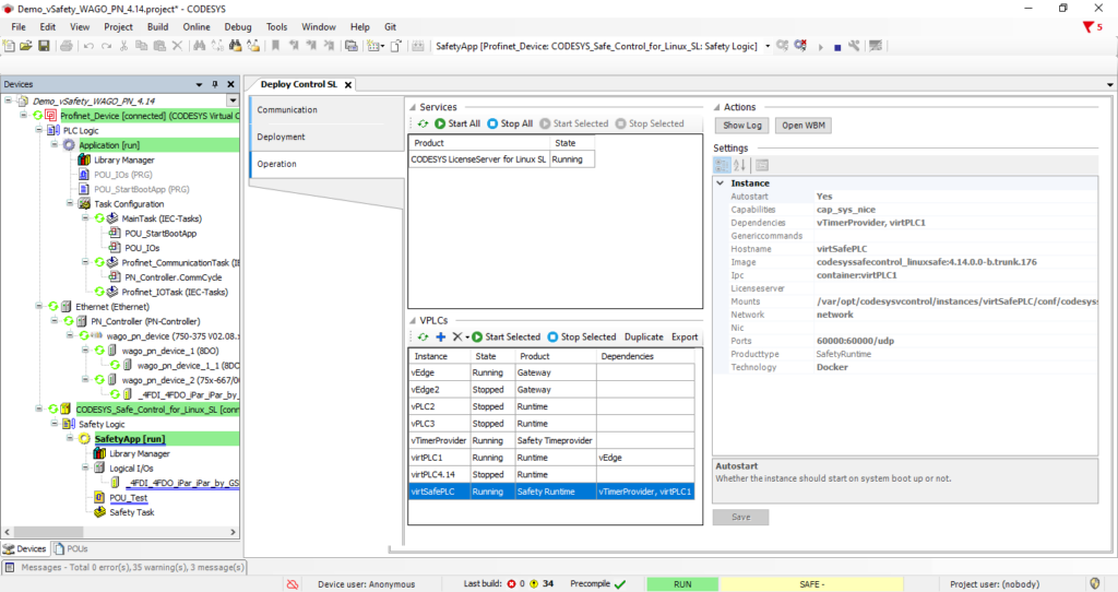 Die virtuelle Steuerung Codesys Virtual Control SL kann bei ausreichender Leistungsfähigkeit der darunter liegenden Hardware nahezu beliebig oft instanziiert und parallel betrieben werden.Damit ist ein neues Maß an Flexibilität gegeben. Zum Erreichen der Zweikanaligkeit nutzt die Software Coded Processing von SIL-istra Systems. Damit können die funktionale und die sichere virtuelle Steuerung hardwareunabhängig im Container laufen. Ob es sich dabei um Industriehardware im Schaltschrank, IT-Hardware im Serverraum oder Edge-Geräte irgendwo dazwischen handelt, spielt dafür keine Rolle. Der E/A-Zugriff erfolgt über physikalische oder per VLAN virtualisierte Ethernet-Ports in Echtzeit. Das gilt in gleicher Weise für Industrial-Ethernet-Protokolle mit Zulassung für sicherheitskritische Anwendungen, wie Profisafe (F-Host/F-Client) oder zukünftig FSoE (Fail Safe over EtherCAT).