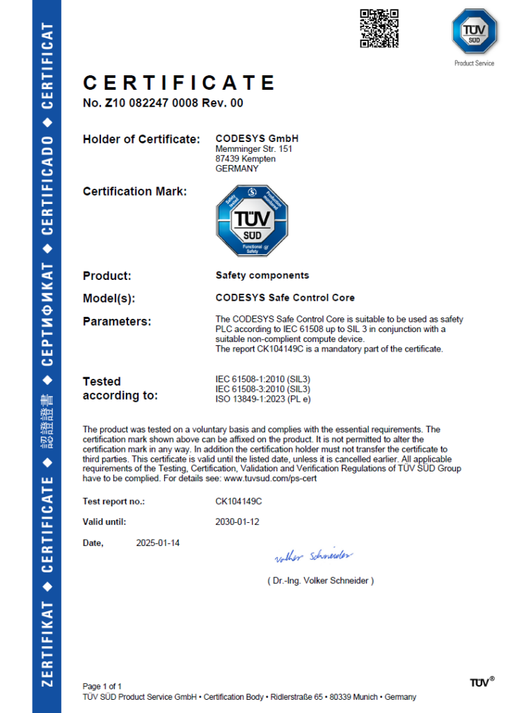 Die Orchestrierung und Konfiguration von funktionaler und sicherer Steuerung erfolgt in beiden Varianten auf ähnliche Weise, und zwar in einem weiteren Add-on des Codesys Development Systems. Unterschiede gibt es lediglich bei den Lizenzkosten. Und natürlich erfordert eine Sicherheitsapplikation auch eine Abnahme bei einem akkreditierten Institut. Dafür bereiten sich Hersteller von Maschinen oder Anlagen mit virtualisierter Safety-SPS genauso vor wie mit dedizierten Geräten – nur jetzt ohne zertifizierte Safety-Hardware. Die spannende Frage von Skeptikern: Ist die Abnahme nach IEC61508 SIL3 überhaupt möglich? Antwort: Ja, der TÜV Süd hat im Januar die Zertifizierung für die Basissoftware von Codesys Virtual Safe Control SL erteilt. Die Sicherheitsabnahme für Maschinen und Anlagen kann jetzt also tatsächlich geräteunabhängig erfolgen. In der ersten Version ist dies für Hardware-Plattformen auf Basis von x86-CPUs mit Profinet/ProfiSafe als Feldbus möglich. Eine Erweiterung auf ARM-basierte Rechnerarchitekturen sowie FSoE (EtherCAT Safety) ist für die nächsten Monate geplant. Somit bietet Codesys Virtual Safe Control SL Herstellern und vor allem Betreibern von Maschinen und Anlagen zusätzliche Freiheit – jetzt sogar für sicherheitskritische Anwendungen. Der erste Einsatz der Software ist in KFZ-Produktionslinien der Audi AG vorgesehen.