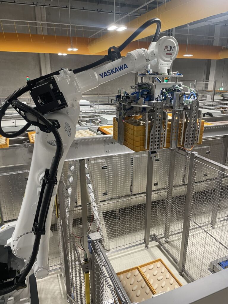 Als weiteres Schlüsselelement kommen in der Anlage insgesamt vier Industrieroboter vom Typ Motoman GP180 FGG des Herstellers Yaskawa zum Einsatz. Für diese Entscheidung sprach zum einen die Geschwindigkeit und Präzision und zum anderen die Tragkraft von 180kg sowie die große Reichweite des Modells. ‚GP‘ steht für ‚General Purpose‘ und damit für vielfältige Einsatzmöglichkeiten. Die 6-Achser, die im Yaskawa-Werk im slowenischen Koevje gefertigt wurden, können in beliebiger Einbaulage arbeiten, Roboterkabel lassen sich entweder seitlich oder durch den Sockel hindurch einführen. Die integrierte Medienversorgung in den Achsen optimiert den Aufbau von Greifern und unterstützt die Zuverlässigkeit im späteren Betrieb. Speziell für die Lebensmittelindustrie hat Yaskawa die Roboterserie Motoman GP FGG entwickelt. FGG steht für ‚Food Grade Grease‘ und damit für den ausschließlichen Einsatz von Schmierstoffen, die für die Nahrungsmittelproduktion zugelassen sind. „Dies war für uns ein entscheidendes Kriterium, da wir höchste hygienische Standards gewährleisten mussten“, betont Peter Dunschen von ADM.