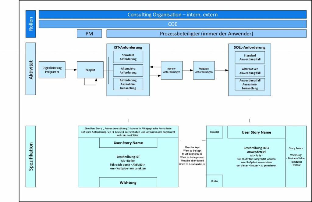 Beschreibung fachlicher, organisatorischer und strategischer Elemente: Die Anforderungsspezifikation beschreibt die Anforderungen auf fachlicher, organisatorischer sowie strategischer Ebene in Form von User-Stories.