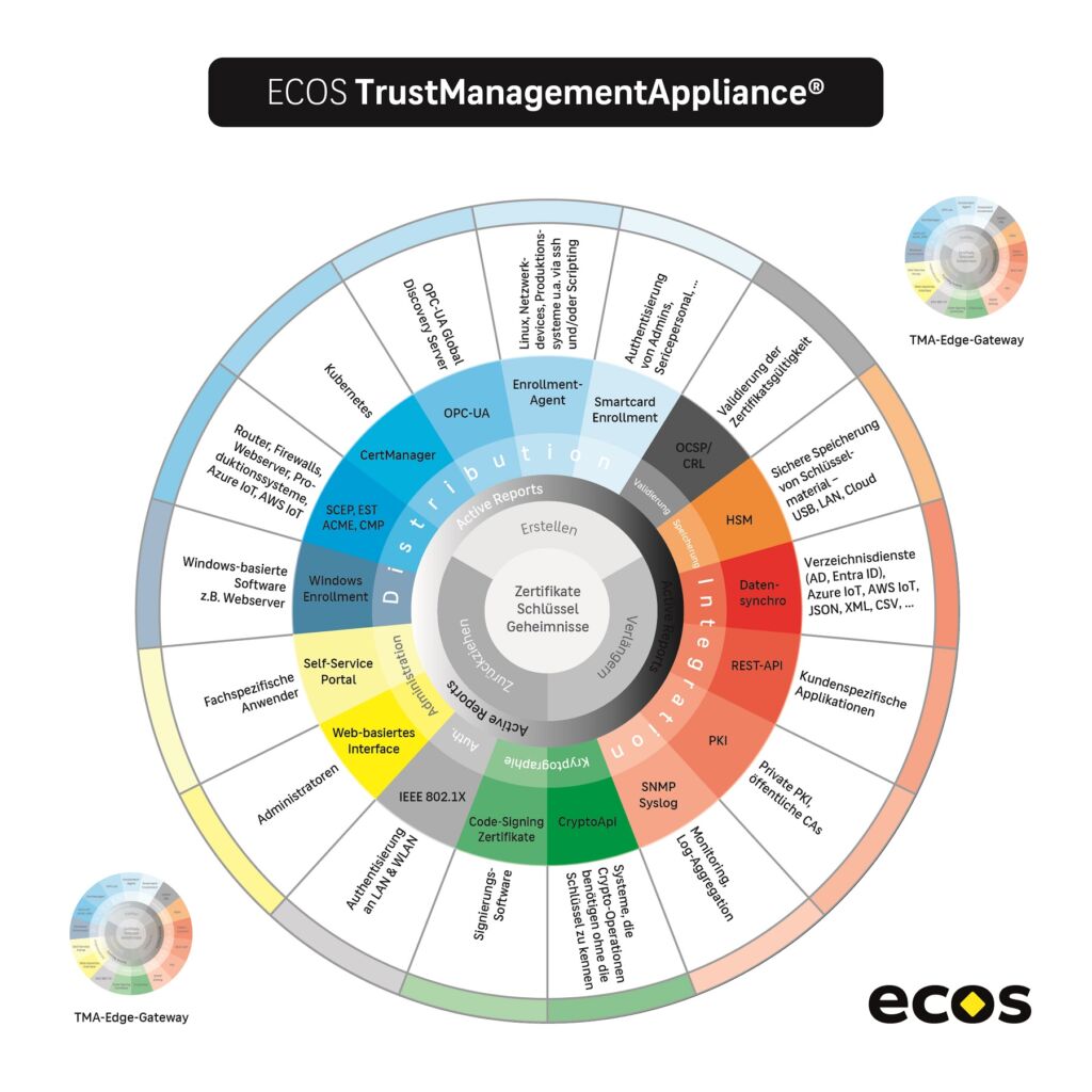 Der deutsche IT-Security-Spezialist Ecos Technology hat bereits auf der Fachmesse SPS Ende letzten Jahres das neue Edge Gateway TrustManagementAppliance vorgestellt. Dabei handelt es sich um eine Software für das Ausrollen und Verwalten von Zertifikaten, die auf Edge Devices eingesetzt werden kann. Dafür sollen weder Administrationsaufwand noch spezielles IT-Wissen erforderlich sein. Das Edge Gateway ergänzt das All-in-One PKI- und Key-Management-System Ecos TrustManagementAppliance. Die Software kann als virtuelle Maschine, in einer Container-Infrastruktur oder auf eigener Hardware betrieben werden. Bei der Validierung von Zertifikaten per OCSP kann das System zudem dort verwendet werden, wo die Zertifikate zum Einsatz kommen.