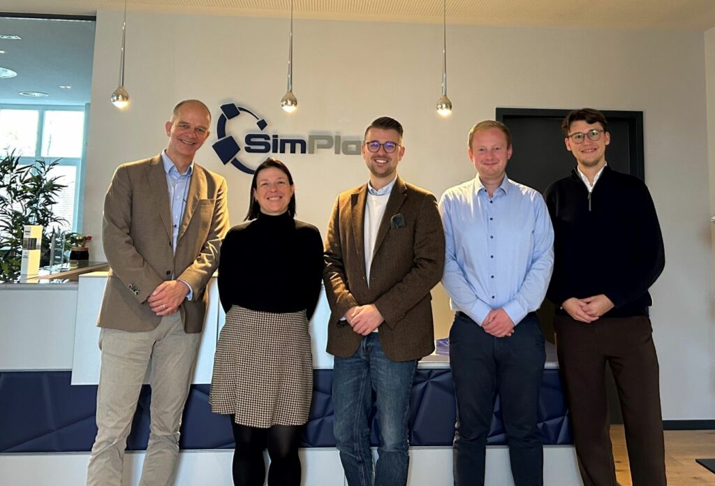 Am 30. Oktober 2024 startete das SIMOBOT-Projektteam mit einem Kick-Off (v. l.): Sven Spieckermann (SimPlan), Ilka Habenicht (SimPlan), Leon Siegl (Frankfurt UAS), Niklas Bott (SimPlan), Jannik Sauer (Continental) und Prof. Dr. Tobias Bornemann (Frankfurt UAS; nicht im Bild). Bild: SimPlan AG