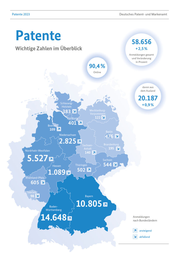 Insgesamt meldeten Unternehmen, Forschungseinrichtungen sowie freie Erfinderinnen und Erfinder 58.656 Erfindungen zum Patent an: ein Plus von 2,5 Prozent gegenüber dem Vorjahreszeitraum. Mit Einsetzen der Corona-Pandemie Anfang 2020 war die Zahl der Patentanmeldungen mehrere Jahre in Folge rückläufig, insbesondere betraf dies Patentaktivitäten aus Deutschland.