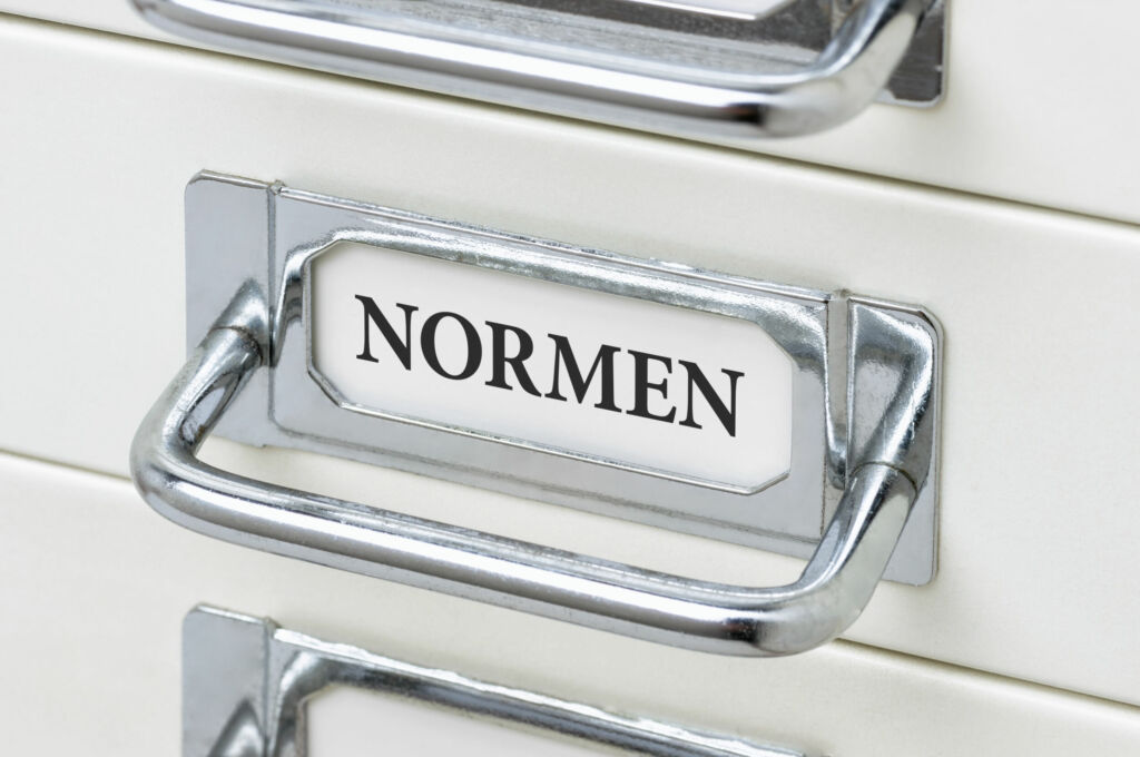 Schubladenschrank mit der Aufschrift Normen