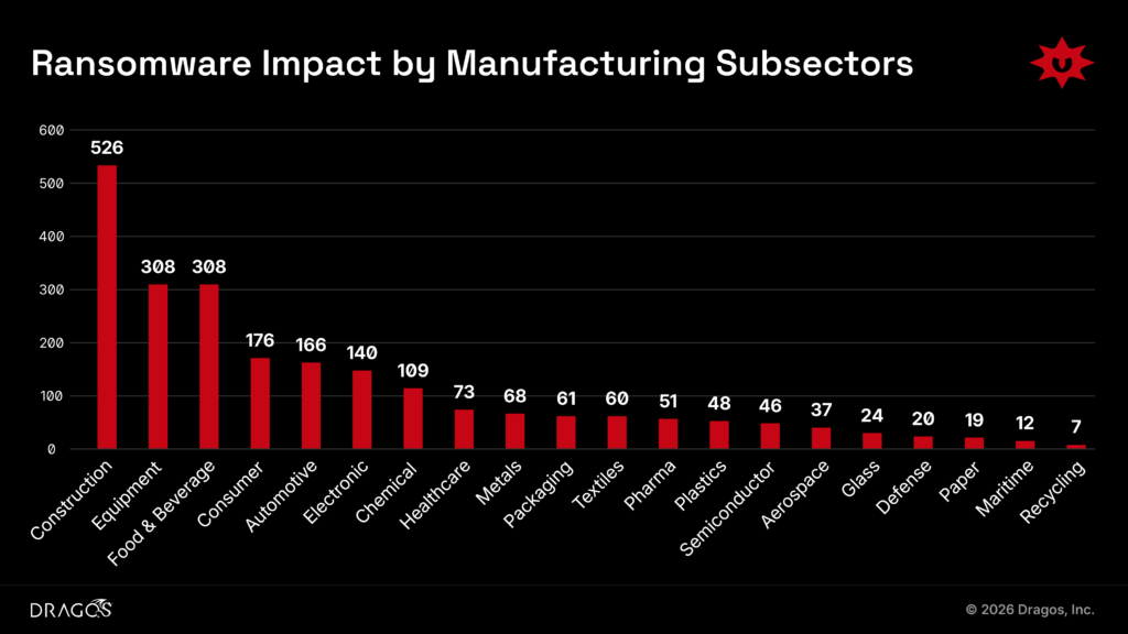 Dragos verfolgte im Jahr 2025 insgesamt 119 Ransomware-Gruppen, mit Fokus auf Industrieunternehmen, gegenüber 80 im Jahr 2024. Weltweit waren 3.300 Organisationen betroffen, mehr als zwei Drittel davon aus der Fertigungsindustrie. Branchenweit lag die durchschnittliche Verweildauer von Ransomware in OT-Umgebungen bei 42 Tagen. Dragos stellte zudem fest, dass OT-Vorfälle oftmals noch immer fälschlicherweise als reine IT-Vorfälle eingestuft werden, da OT-Systeme wie Engineering-Workstations und HMIs aufgrund ihres Windows-Betriebssystems der IT zugerechnet werden.