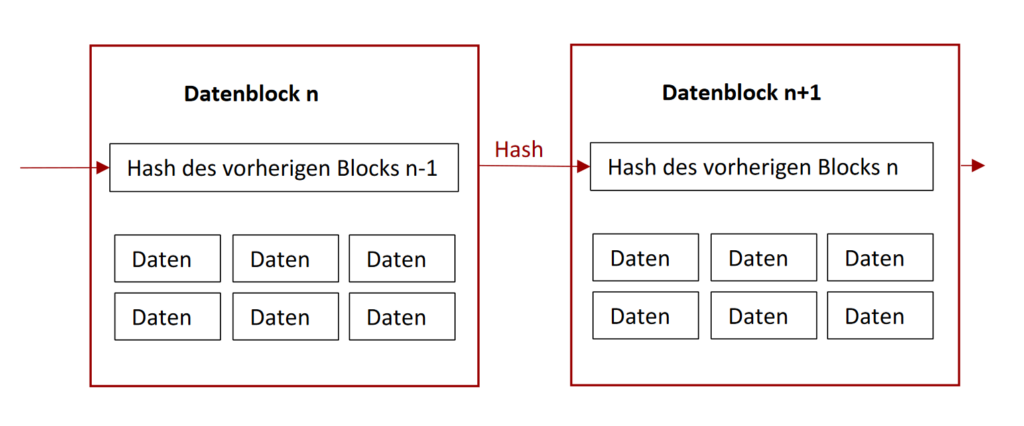 Die Blockchain ist eine dezentrale, digitale Datenbank, die eine kontinuierlich wachsende Liste von Datensätzen in Blöcken speichert. Jeder Block enthält mehrere Transaktionen und ist kryptografisch mit dem vorherigen Block verbunden, was eine Kette von Blöcken bildet – daher der Name Blockchain. Um Integrität und Sicherheit der Daten herzustellen, wird jede Transaktion mit kryptografischen Algorithmen verifiziert. Jeder Block enthält einen Hash, einen einzigartigen digitalen Fingerabdruck, der den Inhalt des Blocks repräsentiert. Dieser Hash wird zusammen mit dem Hash des vorherigen Blocks in den neuen Block aufgenommen, wodurch eine sichere Verkettung entsteht. Ändert sich der Inhalt eines Blocks, ändert sich auch sein Hash, was sofort auffällt und so das Blockchain-Netzwerk gegen Manipulation schützen soll.
