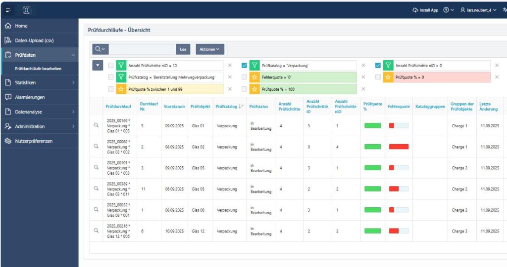 Die Software arbeitet zunächst drei Prüflisten ab, welche jeweils mehrere Prüfschritte beinhalten. Eine Prüfliste ist also eine logische Zusammenfassung mehrerer Prüfschritte. Die Erhebung der Prüfdaten erfolgt pro Produktionsstrecke jeweils feingranular pro Abfüllbehältnis. Durch Zusammenführung der Daten kann eine Datenaggregation/ Verdichtung der Daten auf größere Verpackungseinheiten, z.B. Paletten oder Chargen, erfolgen.