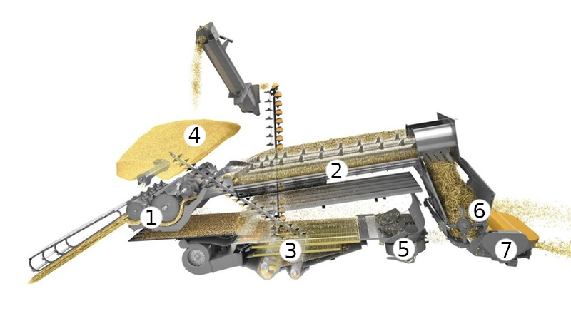 Um den Ansatz von Claas im Projekt GoProZero einzuordnen, hilft ein Blick auf den Ernteprozess. Die Aufgabe eines Mähdreschers besteht darin, Getreide von Halmen und Pflanzenresten zu trennen und das Korn sauber zu gewinnen. Zunächst schneidet das Schneidwerk die Pflanzen ab und fördert sie in das Innere der Maschine. Im Dreschaggregat (1) werden die Körner zunächst ausgedroschen und im Abscheideaggregat (2) und in der Reinigung (3) mithilfe von Sieben und Luftströmungen von den restlichen Pflanzenbestandteilen wie etwa unterschiedlichen langen Strohresten und Spelzen entmischt. Das gereinigte – also von allen Pflanzenbestandteilen befreite – Korn wird im Korntank (4) gespeichert. Die restlichen kleinen Pflanzenbestandteile wie Spelzen werden auf das Feld zurückgegeben (5). Die langen Strohreste werden mit einem am Heck des Mähdreschers integrierten Strohhäcksler (6) zerkleinert und anschließend auf dem Feld verteilt (7).