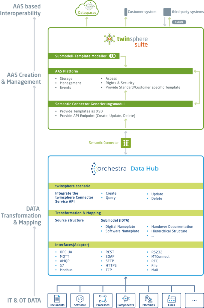 Zusammen bieten beide Plattformen ein integriertes System für die Herstellung und Bereitstellung des digitalen Produktpasses. Twinsphere ergänzt die Funktionen des Orchestra Data Hub durch eine modulare Plattform zur Erstellung und Verwaltung digitaler Zwillinge entlang der gesamten Wertschöpfungskette. Die Nutzung der AAS mit ihren standardisierten Teilmodellen dient der effizienten Datenintegration und der kontinuierlichen Aktualisierung des digitalen Produktpasses, was auf Transparenz und Datenqualität einzahlt. Orchestra wiederum sorgt dafür, dass die Daten erfasst und verarbeitet werden. In Kombination unterstützt dies die Zuverlässigkeit der Prozesse und senkt das Risiko von Ausfällen..