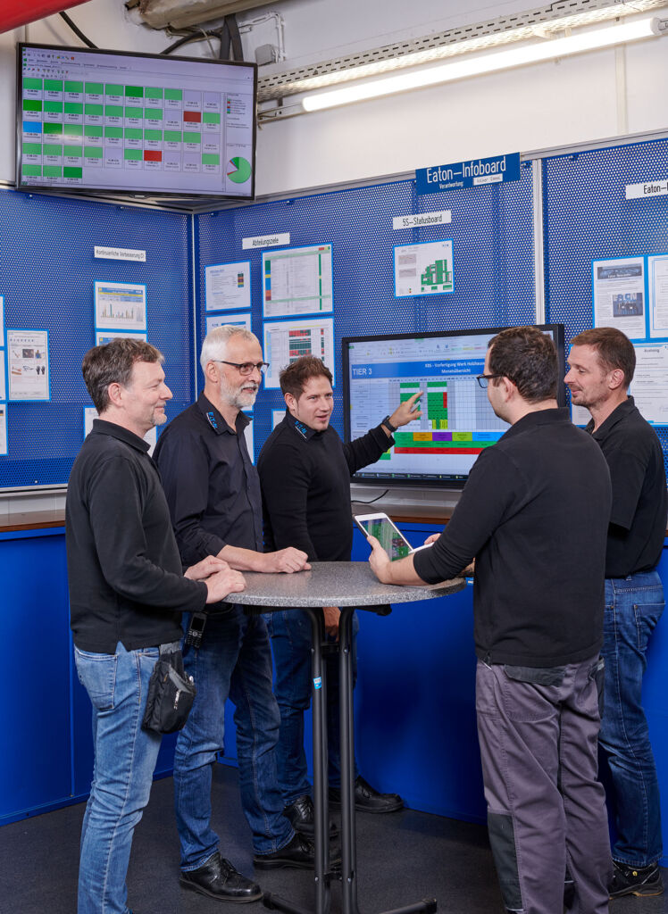 In täglichen ‚Tier-Meetings‘ (abteilungsübergreifende Produktionstreffen) an den Produktions-Cockpits treffen sich Schichtführer, Instandhalter und Produktionsleiter, um auf Basis aktueller digitaler Daten den Status Quo zu besprechen.