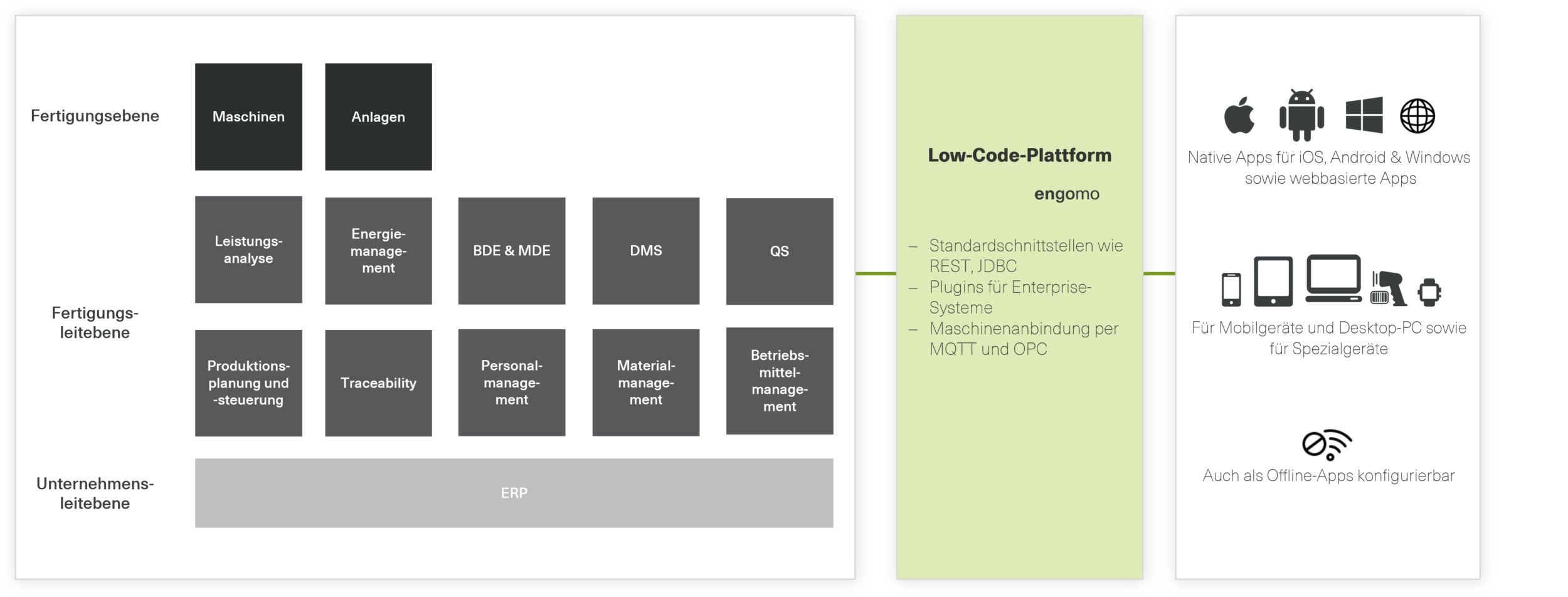 Ob ERP-, MES-, PLM- oder QS-Systeme: Bei aller funktionalen Tiefe dieser Anwendungen gestaltet sich ihre Anpassung an individuelle Anforderungen oft als zeitaufwendig. Insbesondere in Lager und Fertigung entstehen häufig Anforderungen, die diese Standardsysteme nicht abbilden können, was zu Insellösungen führt. Hier setzt Low-Code-Technologie an: Unternehmen können damit mit geringem Programmieraufwand individuelle Systeme entwickeln und integrieren. Benutzeroberflächen werden in ihrer Funktionalität und ihrem Design per Drag&Drop erstellt. Gleichzeitig ermöglicht Low-Code die Anbindung von Backend-Systemen über Standardschnittstellen wie REST und SOAP sowie systemspezifische Plug-ins für den Echtzeit-Datenaustausch.